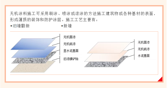 新墻面建議直接在水泥基面上施工無機涂料,因無機物質與水泥基面形成穩(wěn)定的結構,使用防護功能及效果更佳。