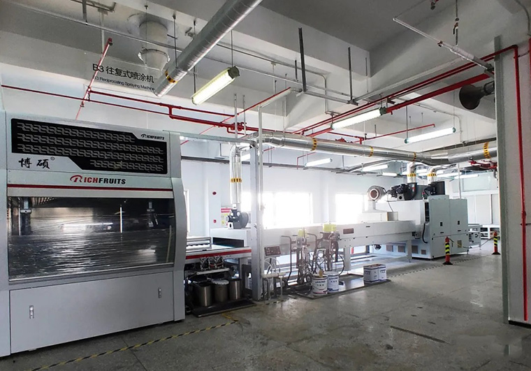 素材→UV往復(fù)式噴涂開放底漆(50-60g/㎡)→UV固化→輕砂→UV往復(fù)式噴涂透明底漆(60-80g/㎡)→UV固化→砂光→UV往復(fù)式噴涂透明面漆(60-80g/㎡)→UV固化