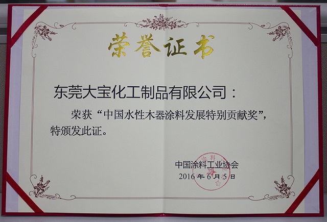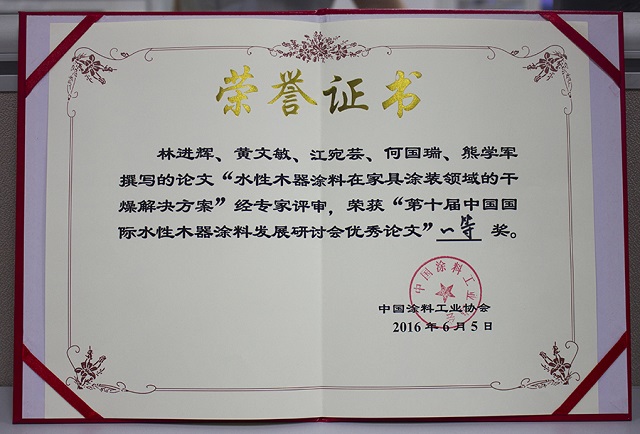 會(huì)議上表彰了一批十年來在推動(dòng)中國水性木器涂料產(chǎn)業(yè)化進(jìn)程中做出特殊貢獻(xiàn)的企業(yè)和個(gè)人,大寶漆除了獲得“中國水性木器涂料發(fā)展特別貢獻(xiàn)獎(jiǎng)”外,由大寶化工技術(shù)部林進(jìn)輝等人撰寫的《水性木器涂料在家具涂裝領(lǐng)域的干燥解決方案》和《自交聯(lián)丙烯酸酯乳液在水性木器封閉底漆中的應(yīng)用研究》還分別榮獲本次論文評(píng)選一等獎(jiǎng)和優(yōu)秀獎(jiǎng),大寶漆還奪得了“全國水性涂裝職業(yè)技能大賽團(tuán)體二等獎(jiǎng)”,而大寶化工工程師周光偉先生憑借多年水性涂裝經(jīng)驗(yàn)和精湛的技術(shù)榮獲“全國石油和化工行業(yè)技術(shù)能手”的榮譽(yù)稱號(hào)。