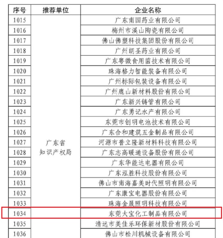 11月25日,國家知識產權局公示了2019年度國家知識產權優(yōu)勢示范企業(yè)評審和復驗結果,東莞大寶化工獲評“國家知識產權優(yōu)勢企業(yè)”,公司指標體系得分90分以上。