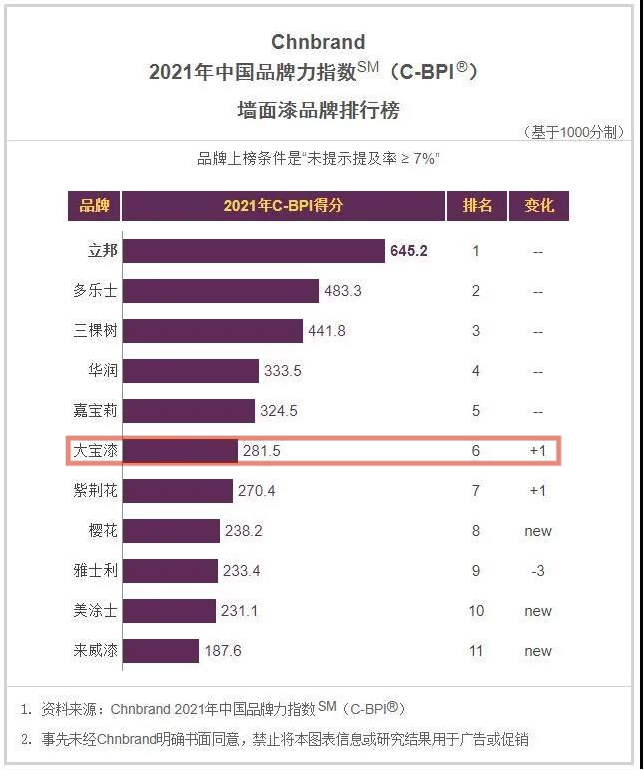4月20日,國(guó)內(nèi)品牌評(píng)級(jí)權(quán)威機(jī)構(gòu)Chnbrand發(fā)布2021年(第十一屆)中國(guó)品牌力指數(shù)SM(C-BPI®)品牌排名和分析報(bào)告,大寶漆再次入榜。