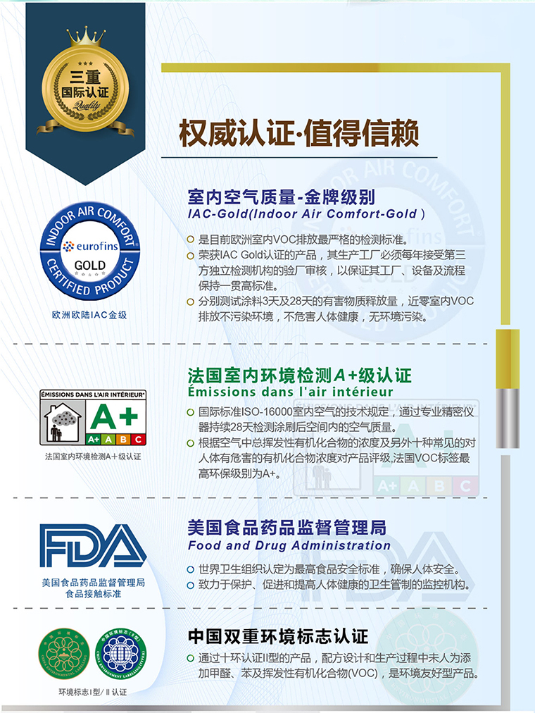 大寶零純+植物抗菌墻面漆取得歐陸歐陸IAC金級、法國A+、美國FDA得三重國際認(rèn)證;中國環(huán)境標(biāo)志認(rèn)證,及24小時室內(nèi)空氣質(zhì)量檢測達到法國A+級環(huán)保檢測,為有快速入住需求的消費群體提供高環(huán)保性能,產(chǎn)品無憂之選。