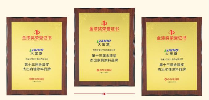大寶漆成功在眾多品牌角逐中脫穎而出,憑借著雄厚的品牌實(shí)力,一舉斬獲“杰出內(nèi)墻涂料品牌”“杰出家具涂料品牌”“杰出水性涂料品牌”三項(xiàng)大獎(jiǎng),這是大寶漆連續(xù)多年蟬聯(lián)該榜單。