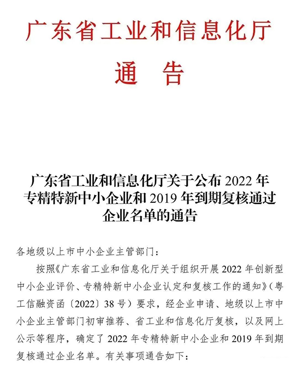 近日,廣東省工業(yè)和信息化廳公布了《關(guān)于公布2022年專精特新中小企業(yè)和2019年到期復(fù)核通過企業(yè)名單的通知》,東莞大寶化工制品有限公司順利通過各級部門的審核,被認定為2022年度廣東省“專精特新”中小企業(yè)。