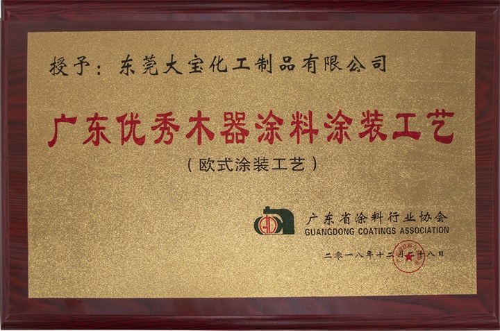 在2018廣東環(huán)保涂裝發(fā)展大會上,舉行了廣東省涂料行業(yè)協(xié)會“涂裝分會”成立儀式、2018廣東優(yōu)秀涂料涂裝項目表彰活動。憑借在綠色涂裝領(lǐng)域的優(yōu)勢和良好口碑,大寶漆被授予廣東省涂料行業(yè)協(xié)會涂裝分會“副理事長單位”。 在大會頒獎環(huán)節(jié),大寶漆歐式涂裝工藝還獲得“廣東省優(yōu)秀木器涂料涂裝工藝”榮譽(yù)。