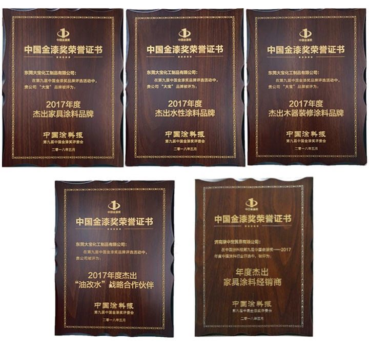作為民族涂料品牌,大寶漆在金漆獎(jiǎng)?lì)C獎(jiǎng)典禮斬獲2017年度“杰出木器裝修涂料品牌”、“杰出家具涂料品牌”、“杰出水性涂料品牌”、“杰出油改水戰(zhàn)略合作合伴”等四項(xiàng)殊榮。同時(shí),大寶漆山東經(jīng)銷商濟(jì)南漆中寶貿(mào)易有限公司獲得2017年度杰出家具涂料經(jīng)銷商獎(jiǎng)項(xiàng)。