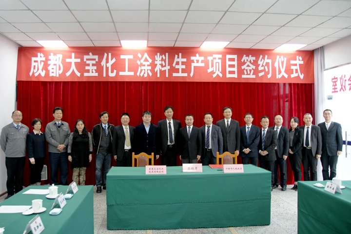 11月11日上午,成都大寶化工涂料生產項目落戶成都市邛崍羊安工業(yè)園區(qū)。中共成都邛崍市委書記曾洪揚、市長惠朝旭、市委常委何興軒等出席了接待儀式,隨后,大寶國際董事長陳賀生與邛崍市副市長周洪彬代表雙方簽約,當日,成都大寶化工制品有限公司宣告正式成立,標志著在業(yè)內具有極高聲譽的大寶漆正式落戶邛崍。