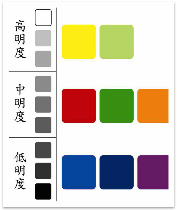 明度是色彩調(diào)和最具影響力的因素,大部分色彩對(duì)比產(chǎn)生的不調(diào)和狀況,均可藉由調(diào)整明度來改善,接下來介紹幾種以明度為主配色法,以同一明度為主,利用不同色相作變化。
