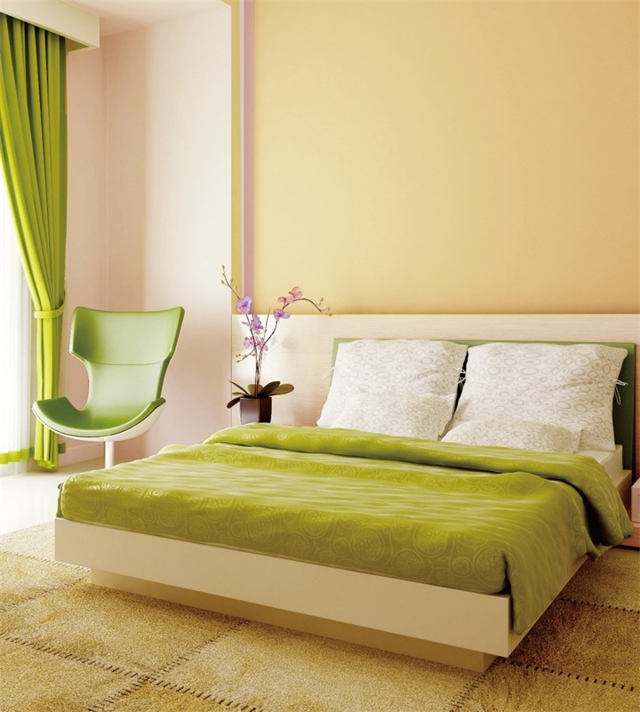 煙波藍(lán)與珍珠粉的淺色系墻面配色運用,使空間變得水嫩活潑。配以鮮綠色和橙黃色的家具作為點綴,則具有畫龍點睛的效果。